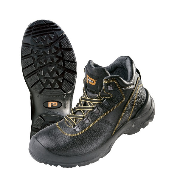 Biztonsági bakancs acél orrmerevítővel és átszúrásnak ellenálló talpbetéttel, antisztatikus, csúszásgátló, sav- és olajálló PU/PU talppal, energiaelnyelő sarokrésszel, lélegző bőrből készült vízálló felsőrésszel, valamint a láthatóságot növelő fényvisszaverő ele