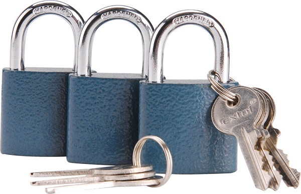 Biztonsági vas lakat klt., 38mm, 3 db lakat+6 db kulcs, univerzális kulcsok: egy kulcs jó mindhárom lakathoz.