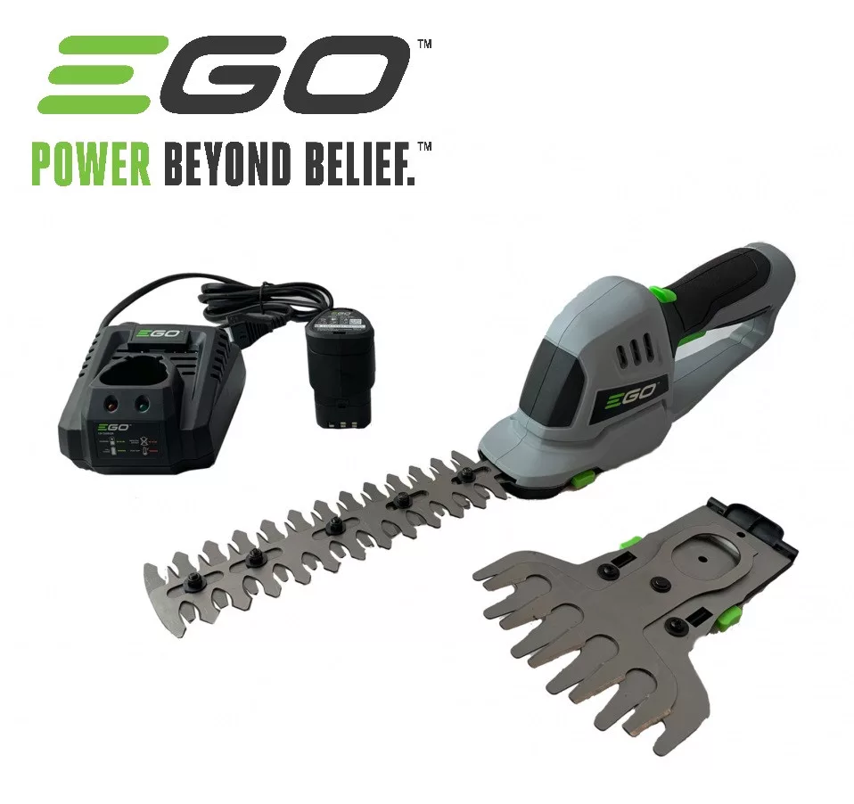 Akkus szegélyvágó szett akkumulátorral és töltővel, sövényvágó kard adapterrel és szegélynyíró adapterrel.