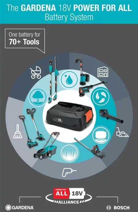 A POWER FOR ALL ALLIANCE a világ vezető gyártóinak egyik legnagyobb, márkákon átívelő akkumulátor-szövetsége. Új GARDENA és BOSCH márkájú termékekkel használható akkurendszer.