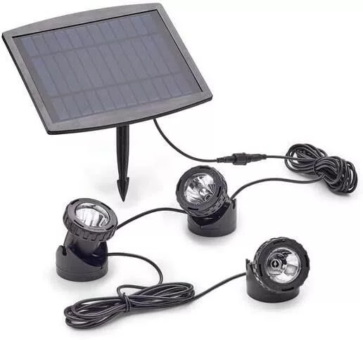 3 db kompakt melegfehér LED spotlámpasor, Lítium-ion akkumulátor és egy napelem panelből álló kültéri tavi világító készlet. Alkalmas állandó használatra víz felett és alatt.
