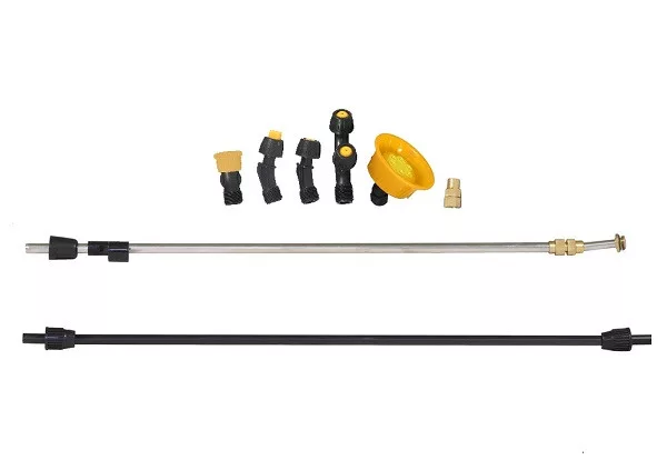 Akku és Töltő alapfelszereltség!/ 5-féle fúvókával (sávszóró, kúpos, kúpos-iker, ködpermet és virágpermetező), fix műa. 60cm szórószár, teleszkópos 60-110cm állítható fém szórószár